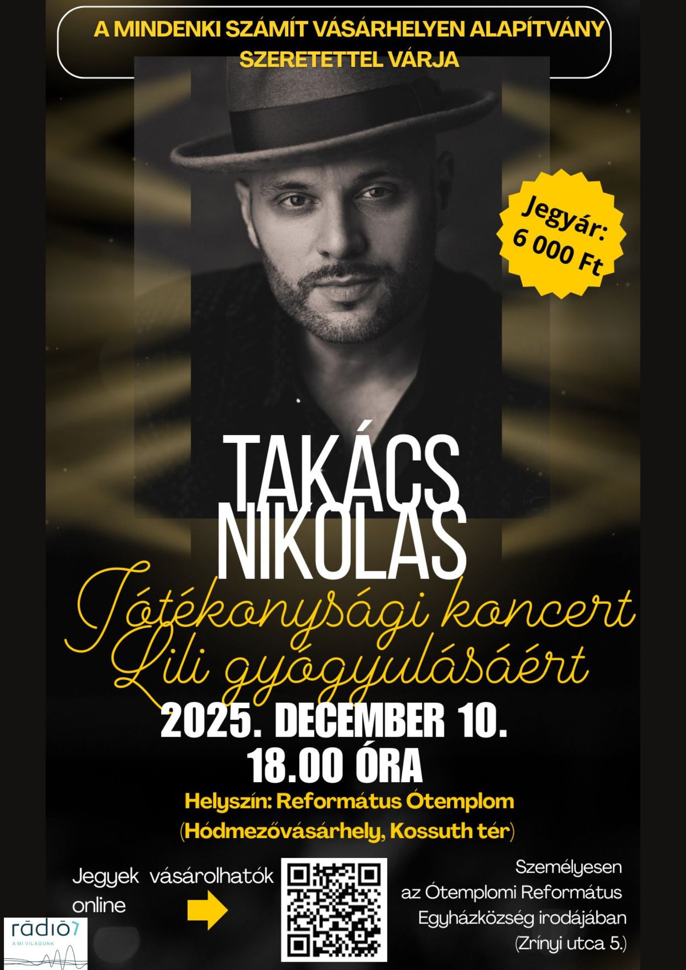 A Mindenki Számít Vásárhelyen ezzel párhuzamosan jótékonysági koncertet is szervez: szerdán este 6 órától Takács Nicolas érkezik a Református Ótemplomba. A bevétellel az agydaganattal küzdő, 9 éves Horváth Lili kezelését, gyógyulását segítik. Jegyek az esemény előtt a helyszínen is vásárolhatók.