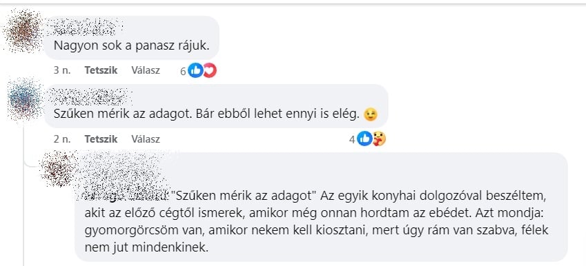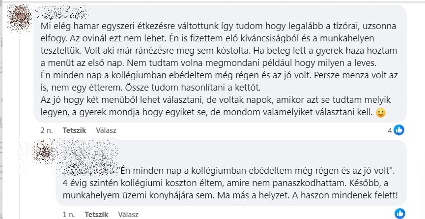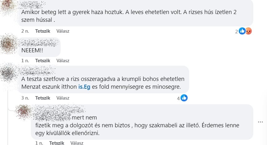Múlt héten megkérdeztük a lakosságot, hogy mondják el, írják le, elégedettek-e a szolgáltatással. A válaszolók többsége negatívan nyilatkozott. A vélemények között van, aki az adag nagyságára panaszkodik, de a legtöbben arra, hogy nem jó, vagy egyenesen ehetetlen, jobb esetben csak beazonosíthatatlan az étel, és van, aki gyermeke tapasztalatait, kifogásait írta le.