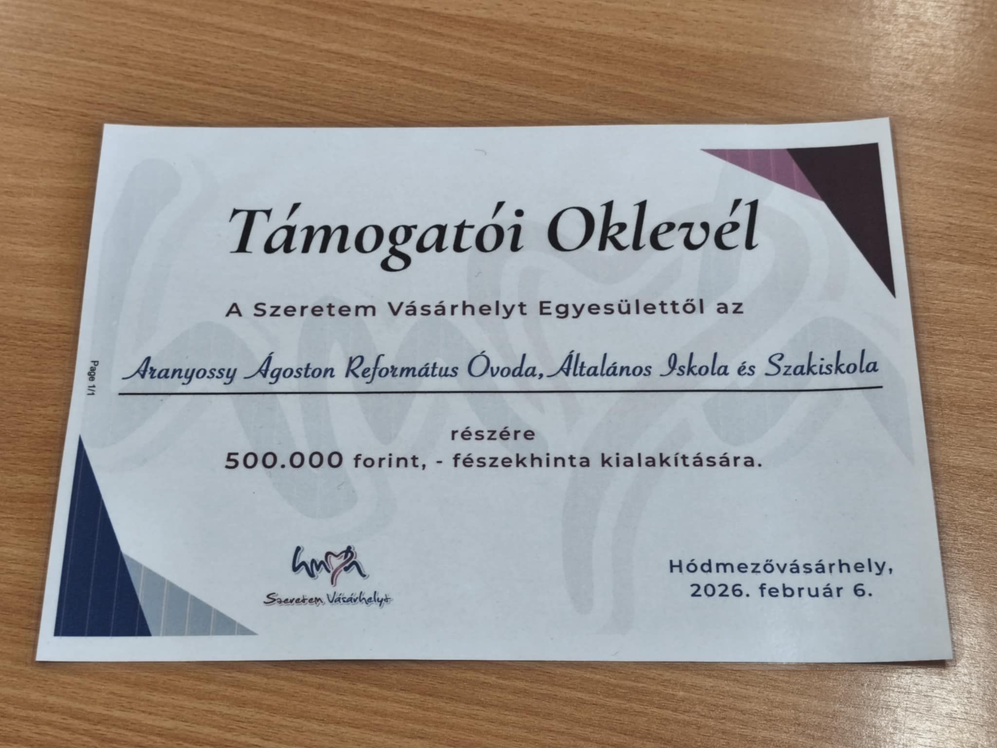 A Szeretem Vásárhelyt Egyesület tavaly év végén is elkészíttette Kincses Vásárhely elnevezésű asztali naptárát, melynek bevételét minden esztendőben jótékony célra fordítja. A civil szervezet ez alkalommal úgy döntött, hogy az Aranyossy Ágoston Református Óvoda, Általános Iskola és Szakiskolát támogatja.