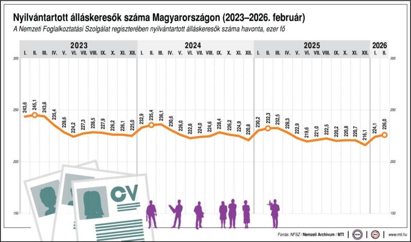 A Nemzeti Foglalkoztatási Szolgálat adatai alapján a regisztrált álláskeresők száma 2026 februárjában 225 994 fő volt, ami az előző év azonos időszakához képest több mint 6 ezer, 2010-hez viszonyítva pedig mintegy 430 ezer fős csökkenést jelent – hívta fel a figyelmet szerdai közleményében Czomba Sándor, a Nemzetgazdasági Minisztérium (NGM) foglalkoztatáspolitkáért felelős államtitkára.