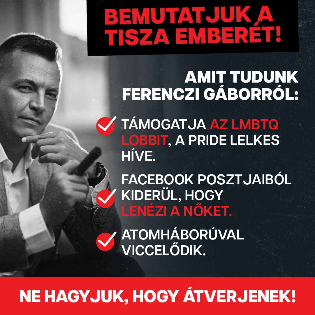 Egy harmadik összefoglalóban pedig hangsúlyozzák: Ferenczi támogatja az LMBTQ-lobbit, a Pride lelkes híve, valamint „Facebook-posztjaiból kiderül, hogy lenézi a nőket”. Hozzáteszik, a tiszás jelölt a közösségi oldalán atomháborúval is viccelődik. (Ami egyébként különesen pikáns annak tükrében, hogy pártelnökéről, Magyar Péterről épp a minap került ki a hangfelvétel, amin maga ismeri el, hogy szerinte is „geci nagy háború lesz” Euópában…)