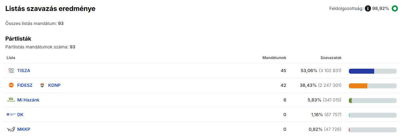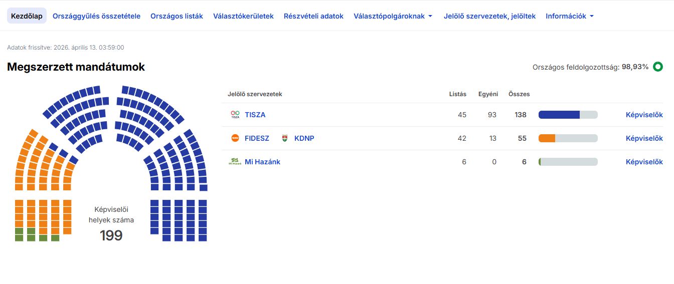 98 százalékos feldolgozottságnál a Tisza Pártnak 138, a Fidesz-KDNP-nek 55, a Mi Hazánknak 6 képviselője lesz.